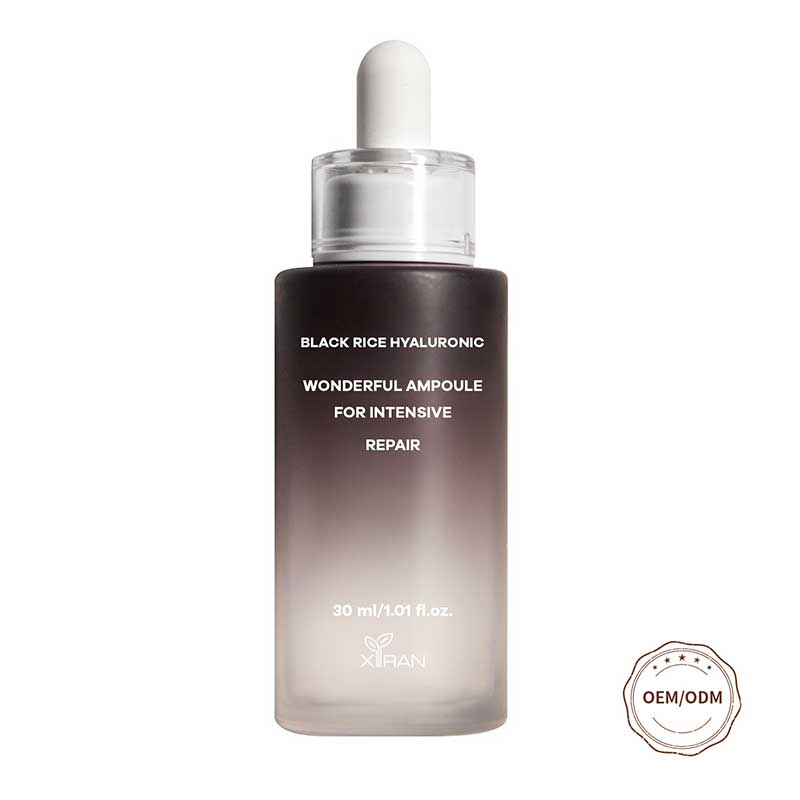 Private Label Black Rice Essence Serum.Infused with Black Rice Extract, Hyaluronic Acid and Adenosine. Delivers deep hydration, reduces wrinkles, and boosts skin elasticity for firmer, glowing skin.