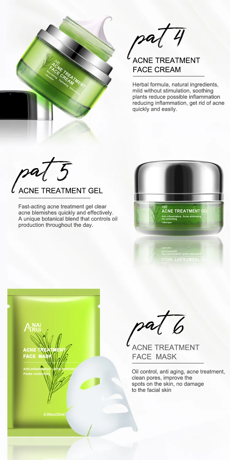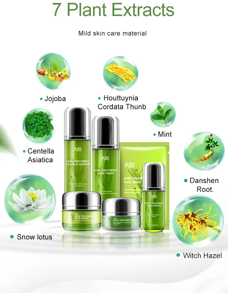 The Private Label Natural Botanical Anti-Acne Skincare Kit contains plant extracts such as tea tree, witch hazel and green tea to effectively fight acne and soothe irritated skin.