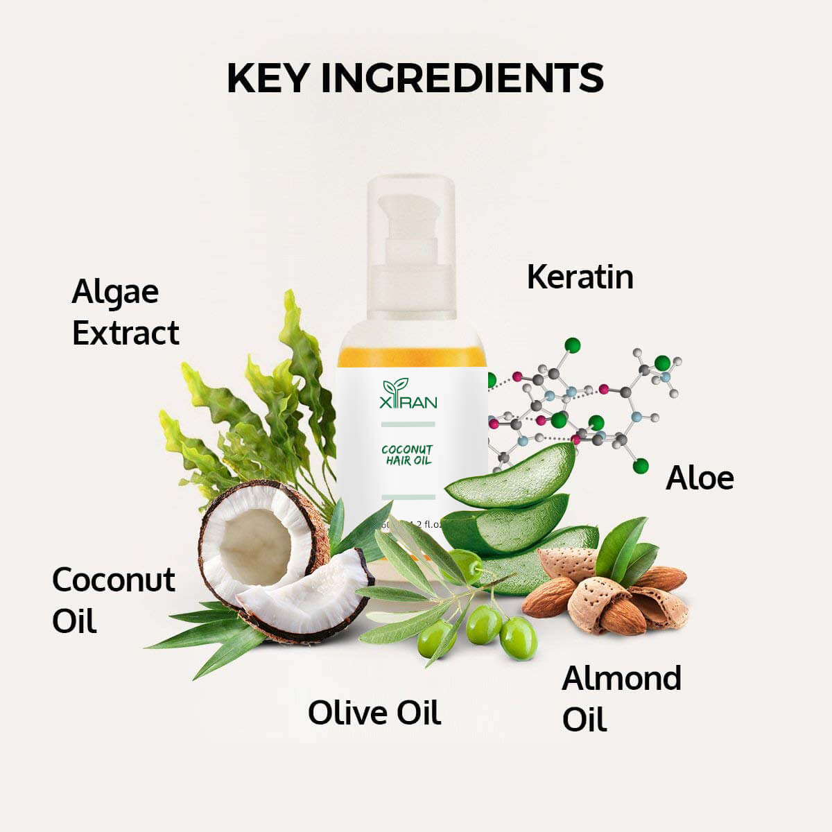 Coconut Oil, Argania Spinosa Kernel Oil, Prunus Amygdalus Dulcis (Sweet Almond) Oil, Olea Europaea (Olive) Fruit Oil, Sclerocarya Birrea Seed Oil, Keratin, Algae Extract, Aloe Barbadensis Leaf Juice, Pentylene Glycol, Caprylhydroxamic Acid, Glyceryl Caprylate.