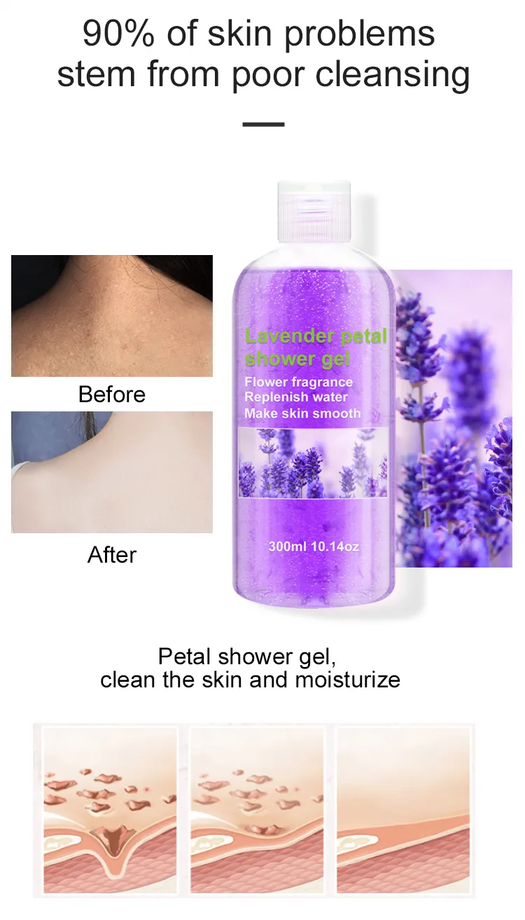 The Private Label Shower Gel Lavender Petals Fragrance Body Wash offers a luxurious and soothing cleansing experience with its delicate lavender shower gel formula.